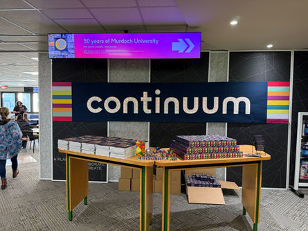 The Service Design (GRD310) cohort is responsible for planning and installing this year’s Creative Media Showcase (CMS), an event that presents Creative Media students’ work to the public. The CMS takes place in the Geoffrey Bolton Library each year around late November. Our goal is to create an engaging and memorable experience that allows attendees to fully appreciate and enjoy the showcased work. The 2024 theme is Continuum, aligning with Murdoch University’s 50th Anniversary.